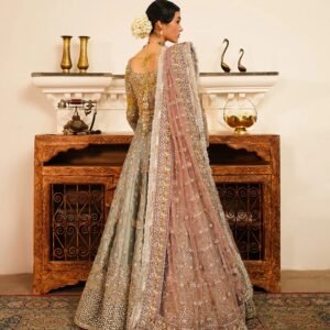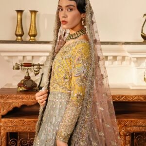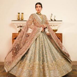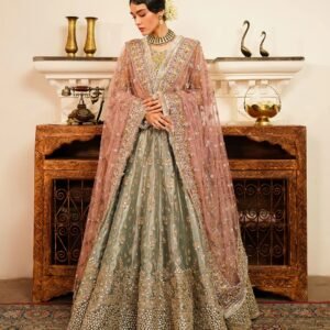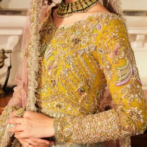 An ode to the Mughals’ love for the summer gardens, Najmeh features a composition of floral patterns bordered by laurel leaves in playful hues, while the lehenga is uplifted by a sophisticated layering of techniques of tilla, naqshi, gota and resham. This ensemble is paired with an embellished net dupatta. Rooted in vintage glamour, Najmeh is the ultimate in festive luxury.