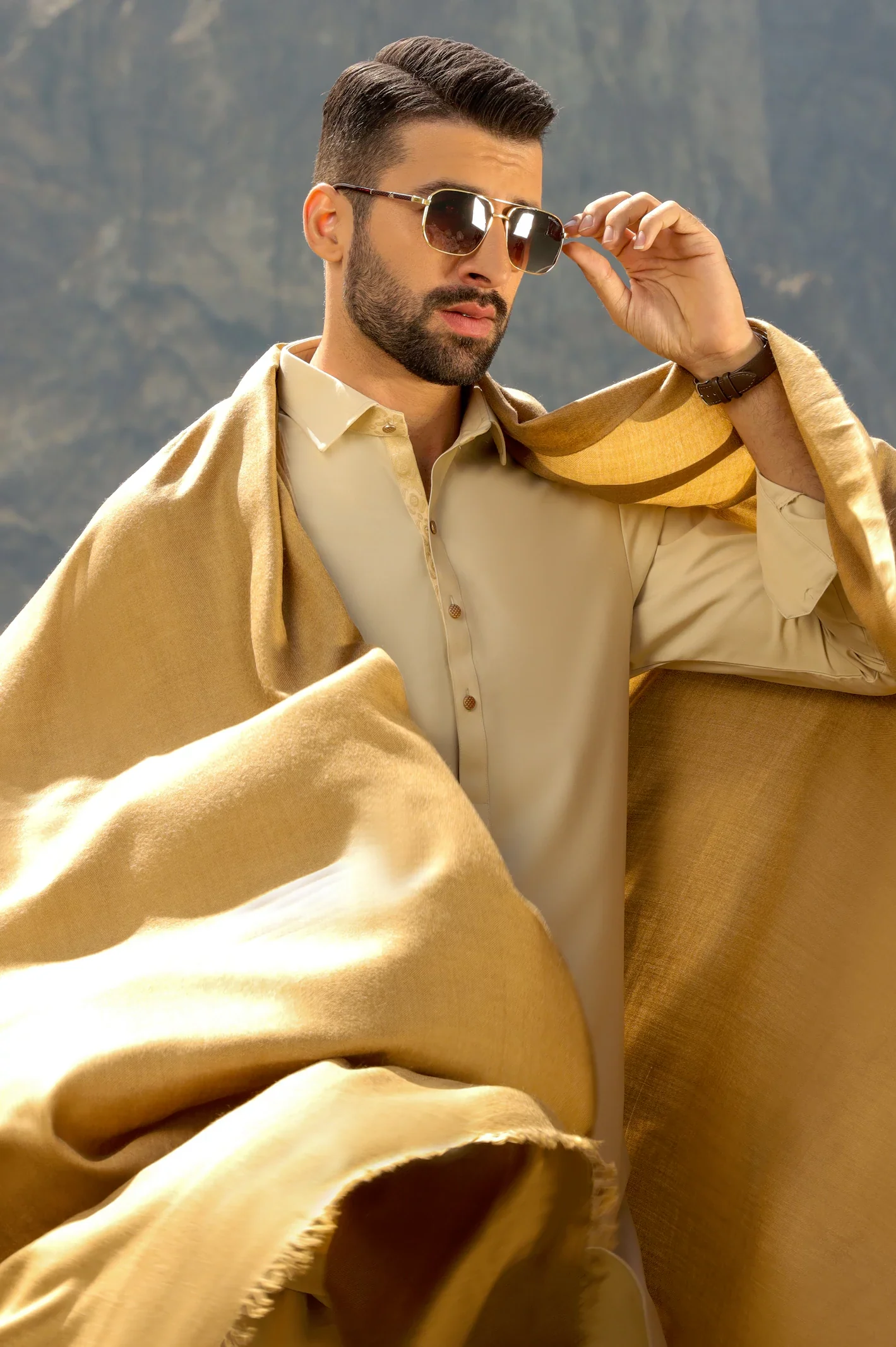• The shawl comes in a versatile camel hue, allowing for easy pairing with different outfits.