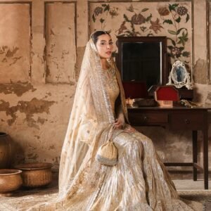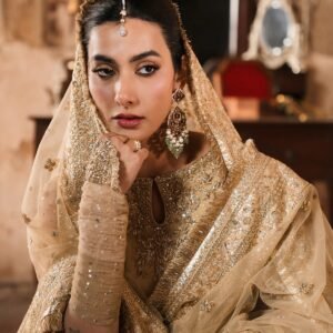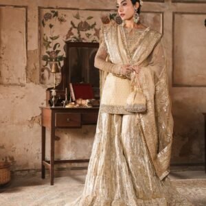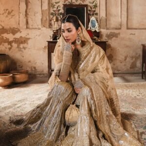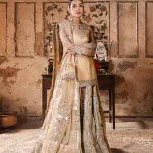 Exuding elegance, Camillie is an extravagant ode to old-world charm. Cut from kundan zari and net sleeves, the gold shirt features an assortment of intricate adornments of pearl, sequins and dabka. Paired with an embroidered net dupatta and an embroidered zari net gharara that lend the ensemble a fluid silhouette, this piece is a total showstopper that you will cherish for years to come.
