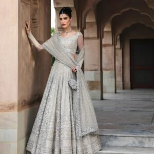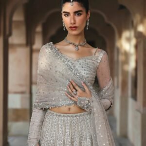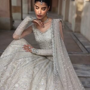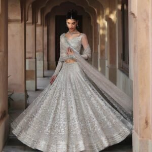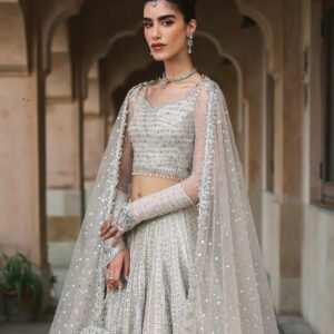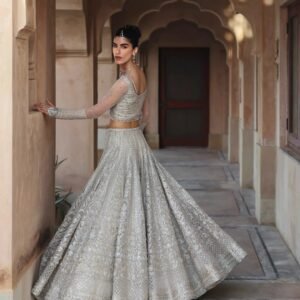 Description: Fusing immaculate craft with a classic silhouette, Cammi radiates grandeur. Cut from white net, the lehnga, choli and dupatta feature lavishly adorned resham, crystal and tilla motifs that sparkle with each step, making it a staple in your festive wardrobe.