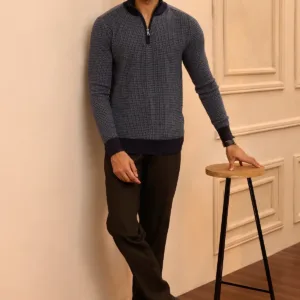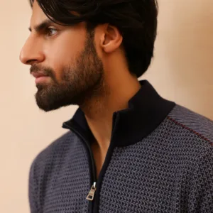 Color and Style: Featuring a subtle geometric pattern in a deep, rich tone, this sweater exudes elegance and charm. The contrasting blue zipper and collar add a modern twist, allowing it to be styled effortlessly for various occasions.