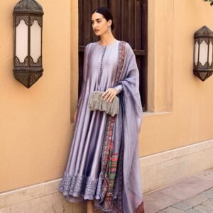 Crafted with meticulous attention to detail, Mersera showcases refined elegance. Composed on opulent silk, the mauve grey kalidaar and culottes feature intricate resham embroidery patterns that add a touch of glamour to the ensemble. Paired with a statement floral printed and embroidered cotton net dupatta, this piece is a modern classic that will make you look unforgettable at every event.