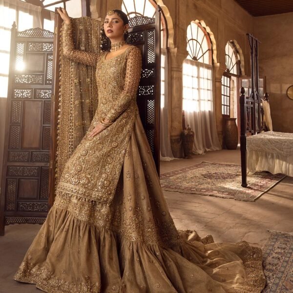 Description: Fashioned in a dainty khaadi net fabric, Naisha is an epitome of classic elegance. This set features a tessellated jaal of hand-cut sequins, dabka and naqshi layered with contrasting red blooming florals etched in resham and zardozi. Its richly detailed jaal is entwined with linear design accents wrought with cut dana and tilla that run through the length of the shirt. Paired with a gorgeously ornamented farshi gharara, gold dupatta adorned with an encrusted border all over and a contrasting red chaddar, Naisha is timeless in appeal.