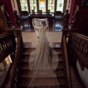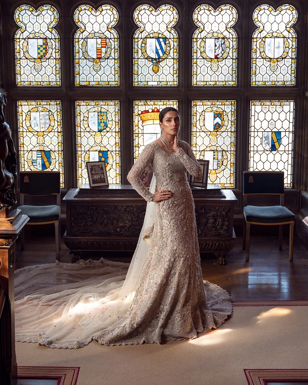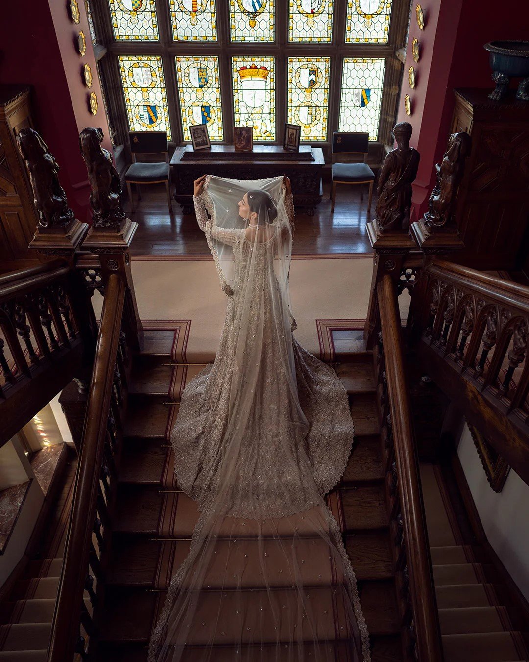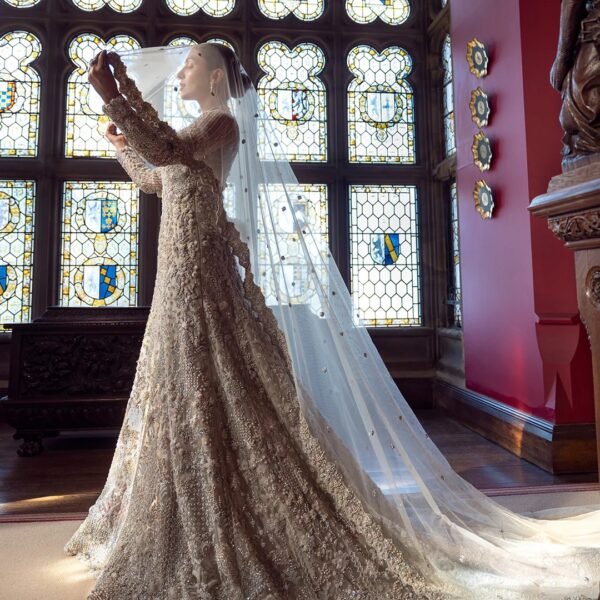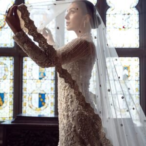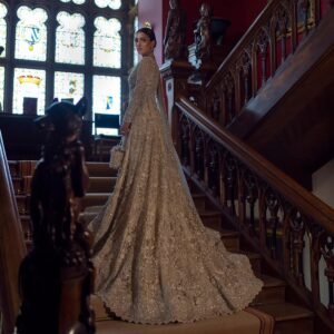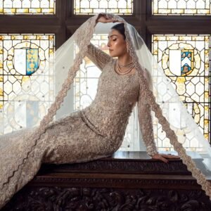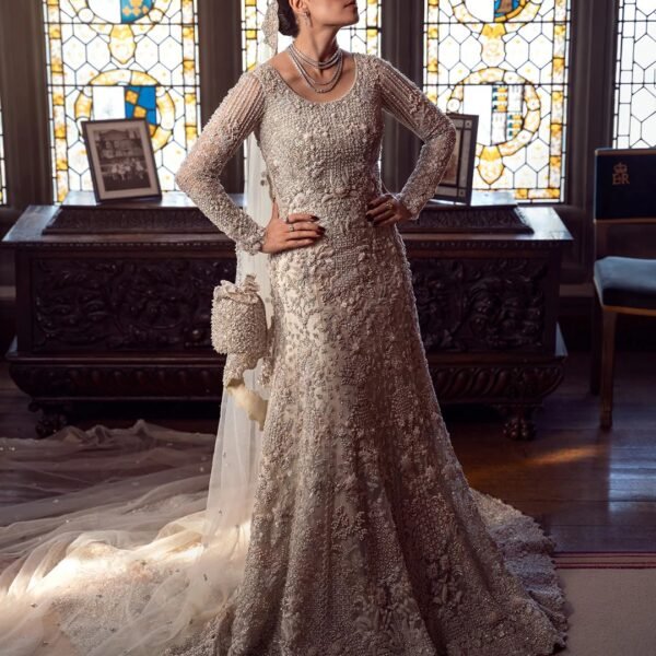 Description: Infused with contemporary sophistication Reem redefines luxury. The bridal set dazzles with glittering crystals, pearls and magnificent tilla arranged stunningly to showcase a dreamy garden. Ornate floral embroideries are elevated using 3D embellishments on the finest tulle fabric. A glorious veil adds a gossamer layer to Reem and transforms it into a moment of poetry.