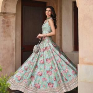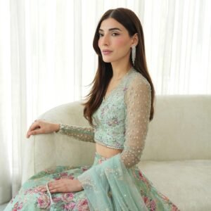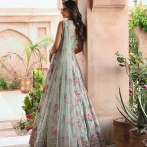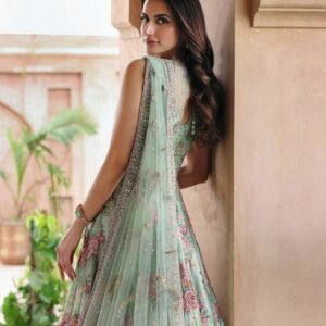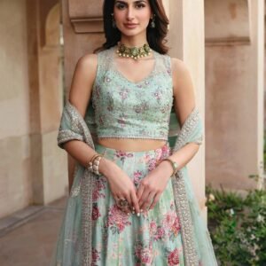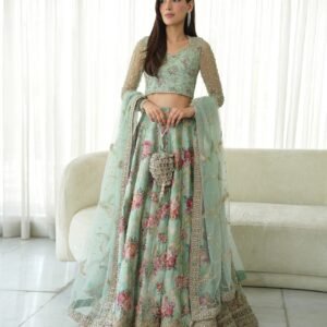 Description: Marked with refined elegance, Rosabella is an ethereal canvas of craft. Cut from sea green opulent silk, the lehnga features a majestic floral print elevated with resham and zari adornments. Paired with a silk blouse and a delicately embellished net dupatta, this set will shine a spotlight on you at every occasion.