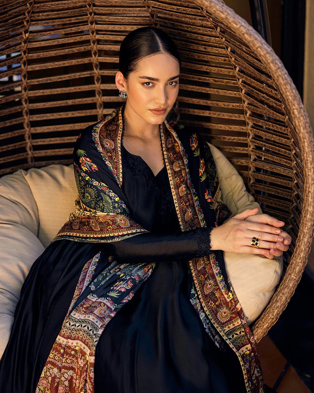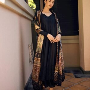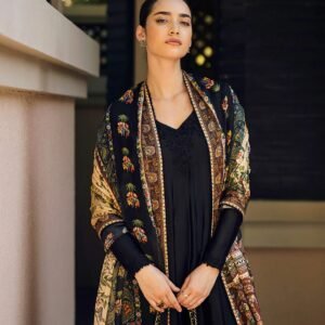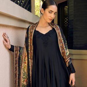 Exuding sheer grace, Shelina is a true statement piece. Cut from opulent silk, the black kalidar features lavish resham embroidery work, complemented perfectly by the voluminous silhouette of the ensemble, further accentuated by the embroidered silk culottes. This set also includes a delicately embroidered printed silk dupatta, lending the ensemble a captivating allure, ensuring you stand out each time.