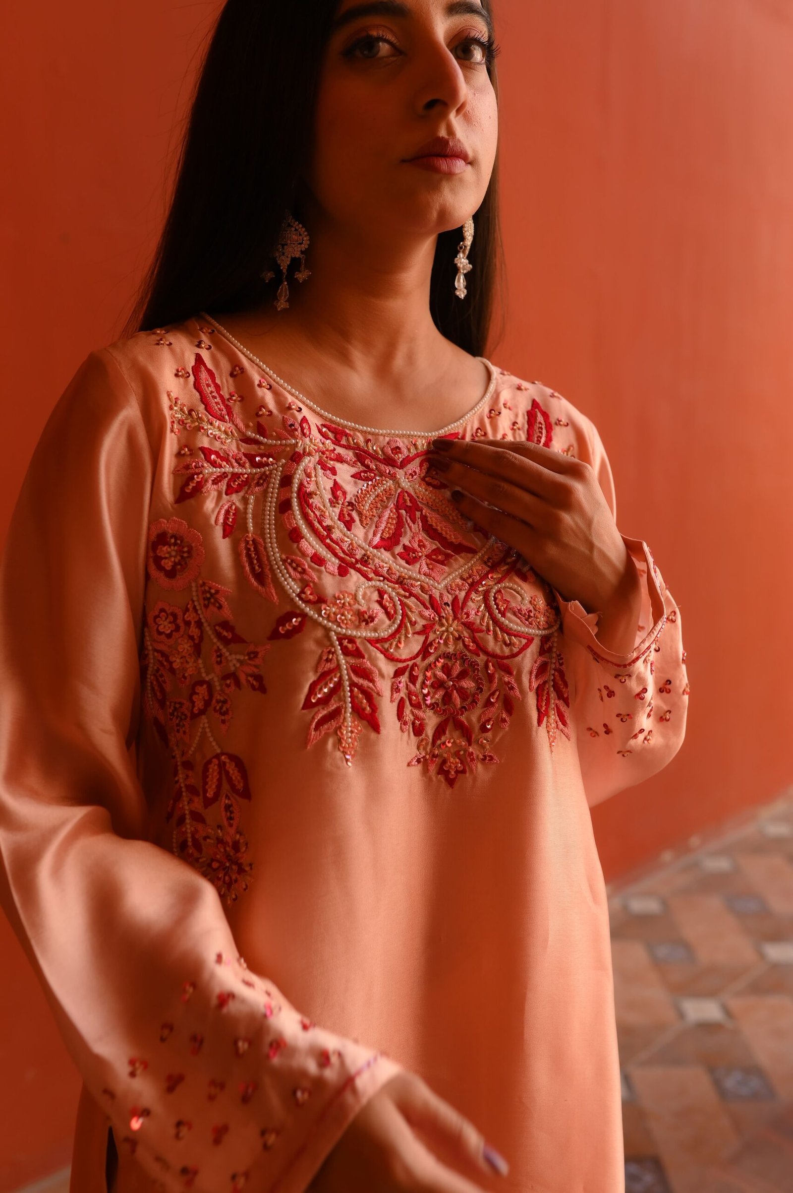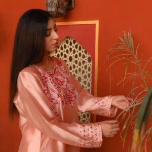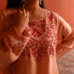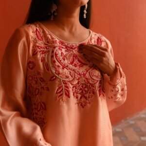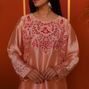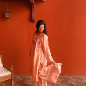 The smooth Sheesha Silk fabric enhances the outfit’s graceful fall, making it both lightweight and luxurious. Paired with a matching soft-flow dupatta, this outfit is the perfect balance of modern minimalism and traditional artistry.