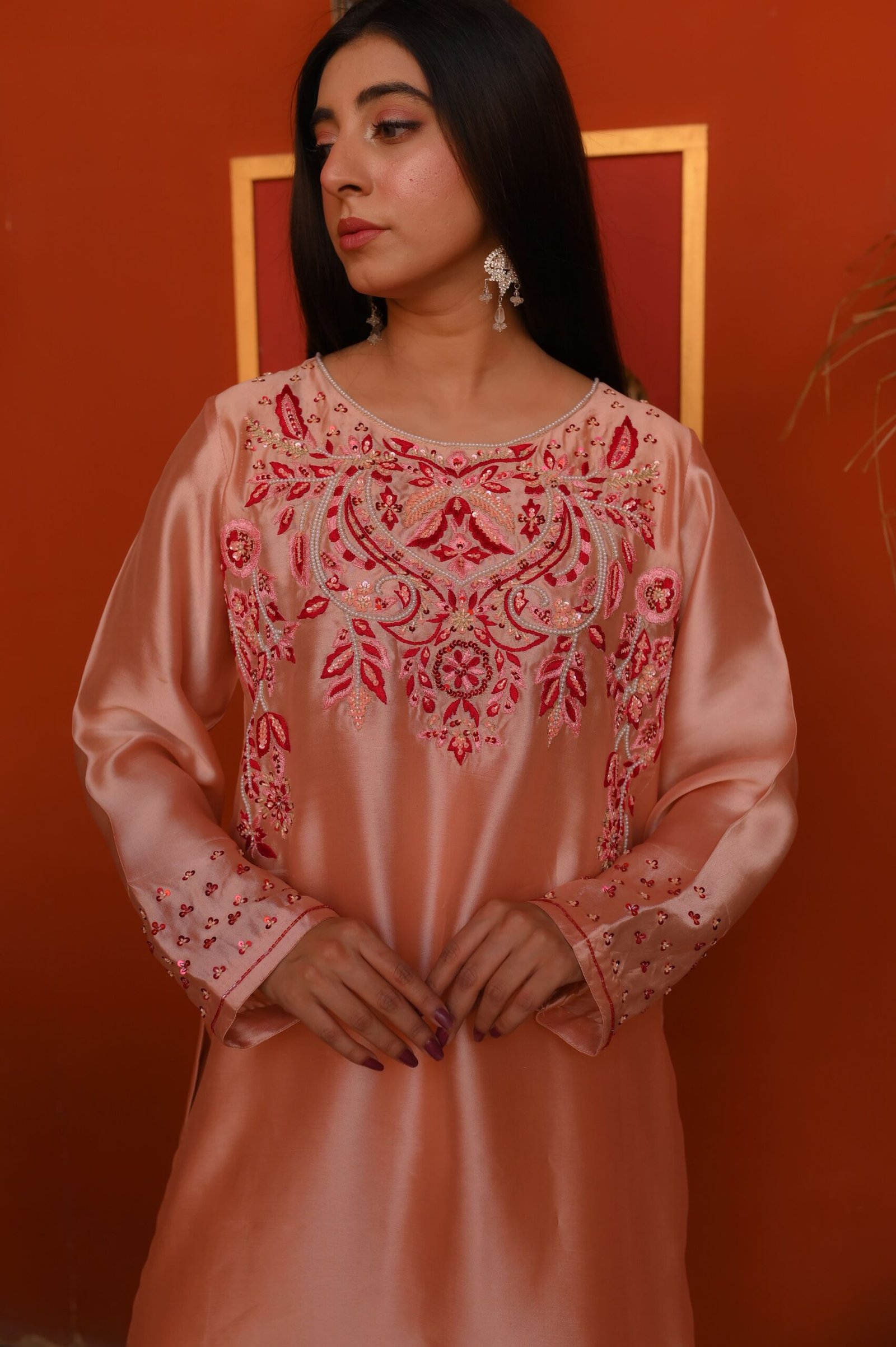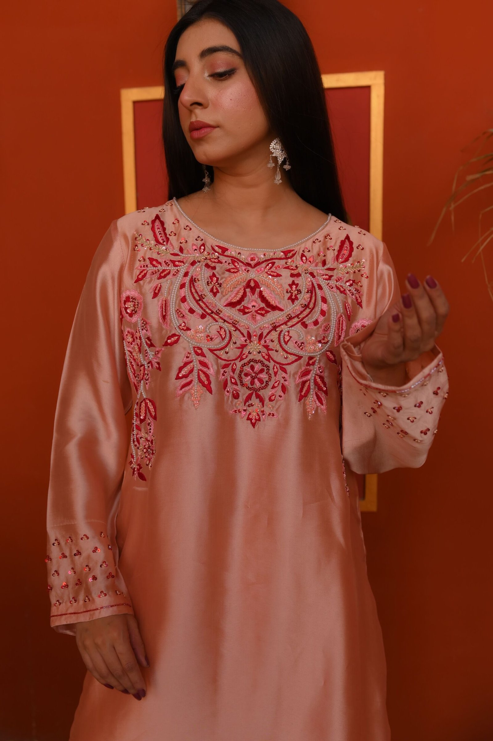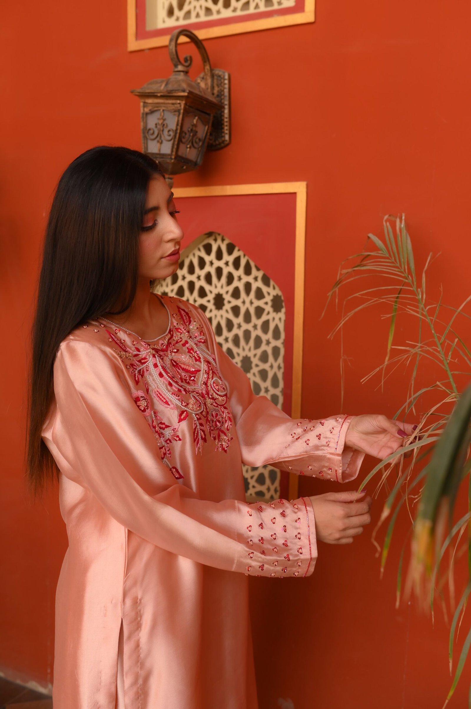 Ideal for daytime events, festive gatherings, and refined celebrations, this blush Sheesha Silk ensemble delivers timeless charm and understated luxury.
