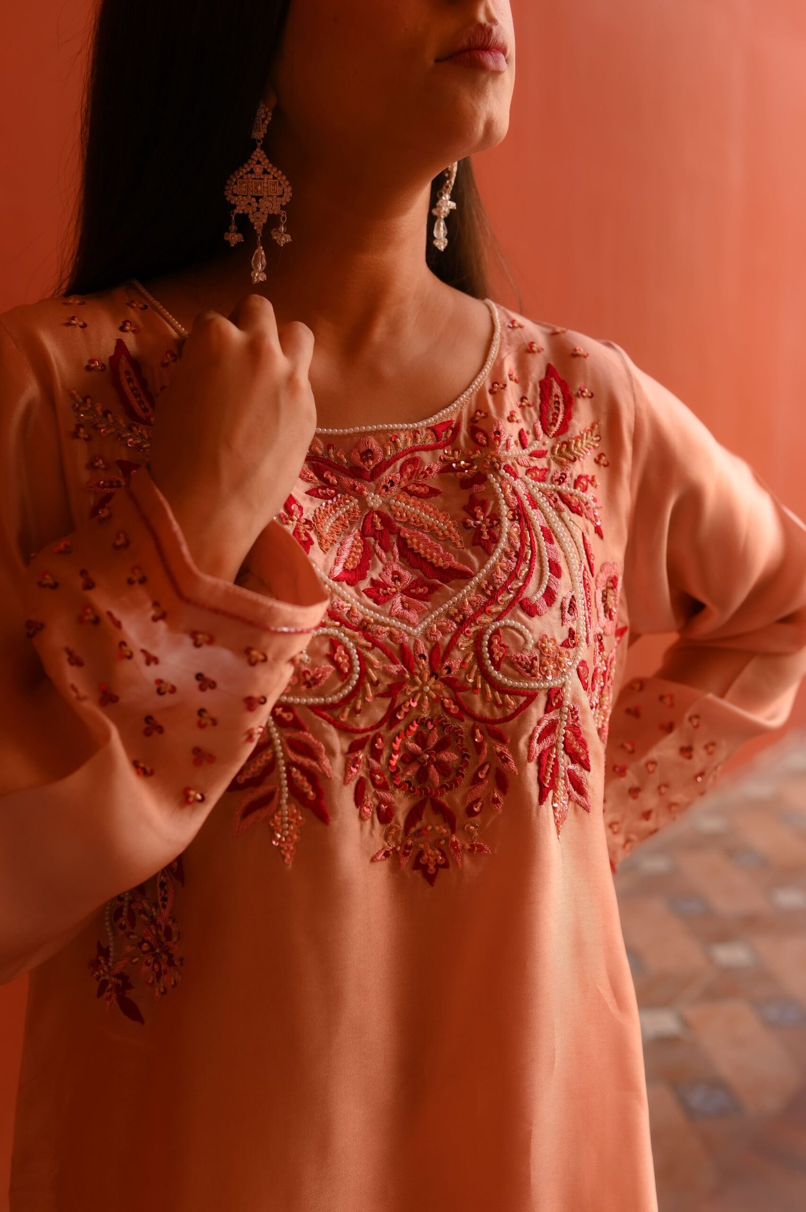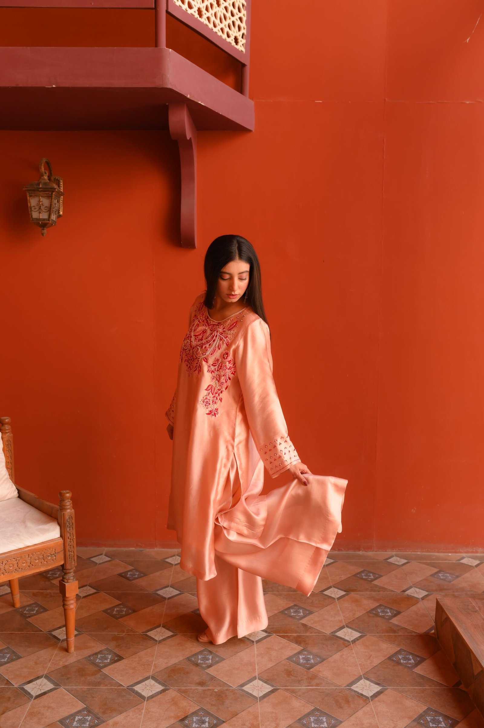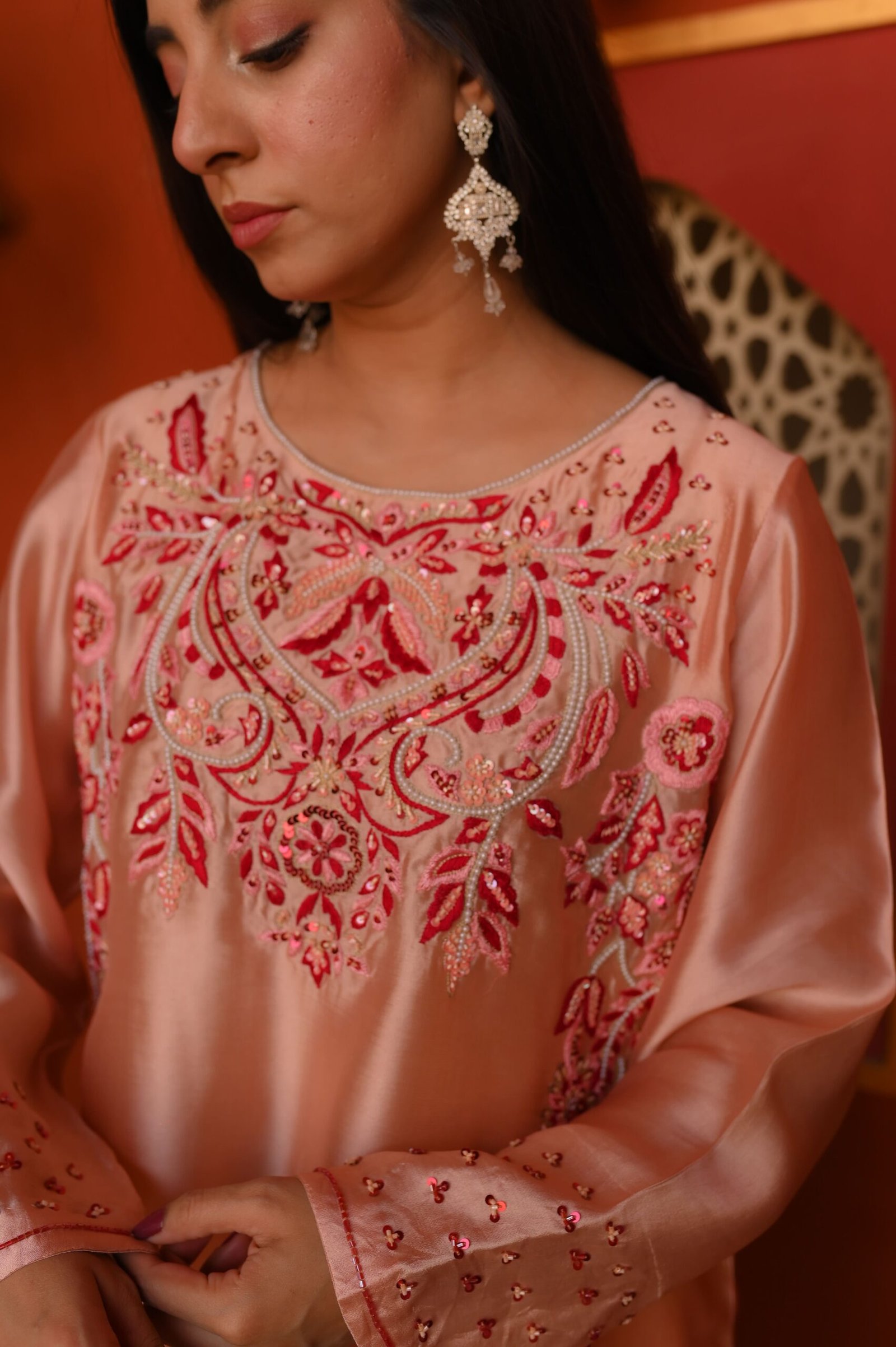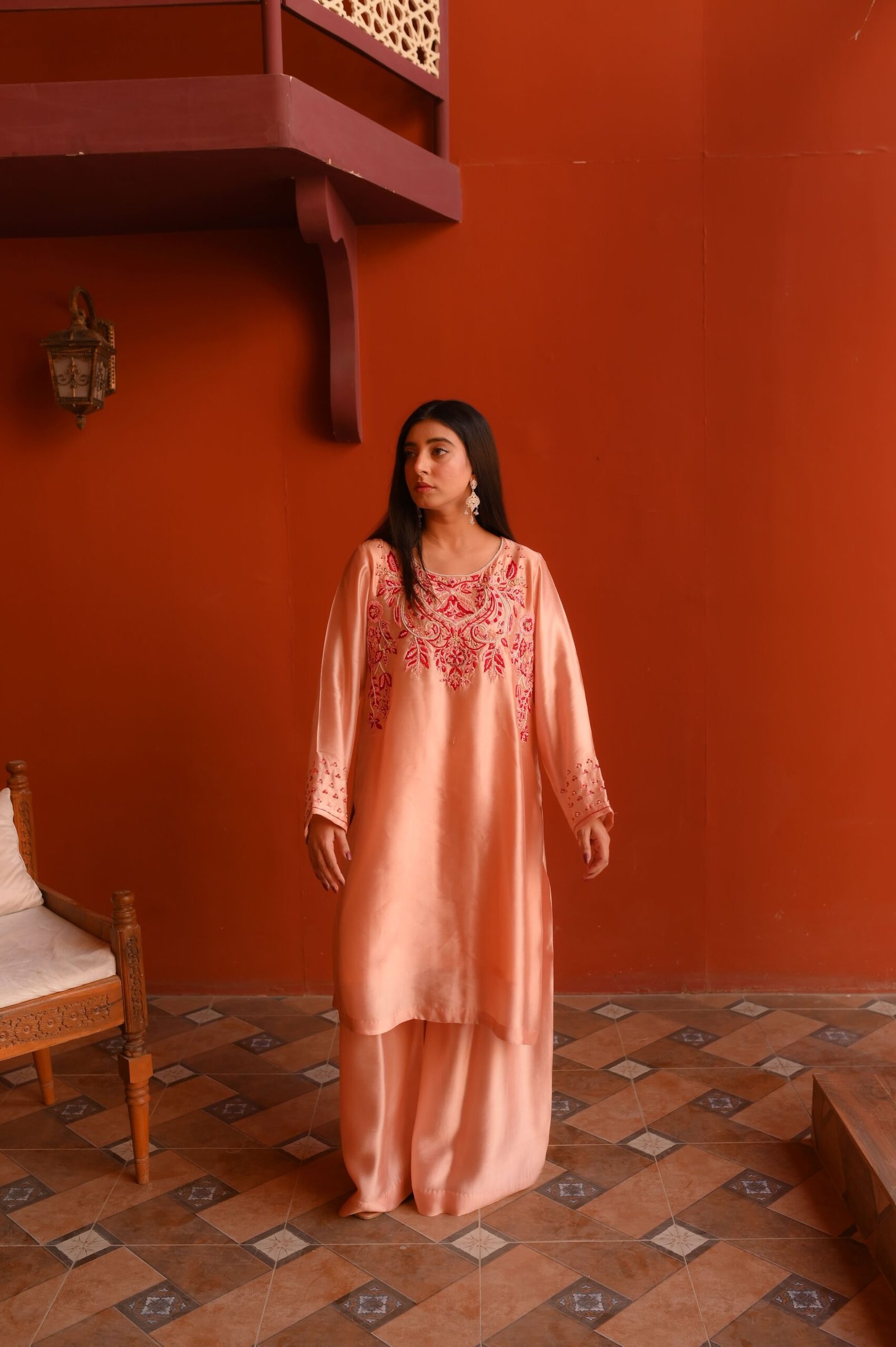 Ideal for daytime events, festive gatherings, and refined celebrations, this blush Sheesha Silk ensemble delivers timeless charm and understated luxury.