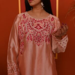 Indulge in soft elegance with this stunning blush-pink ensemble, crafted from luxurious Sheesha Silk that drapes effortlessly with a natural sheen. The sleeveless silhouette features exquisite hand-embellished work across the neckline — a refined blend of ruby-toned stones, sequins, and intricate thread embroidery that adds depth, glamour, and sophistication.